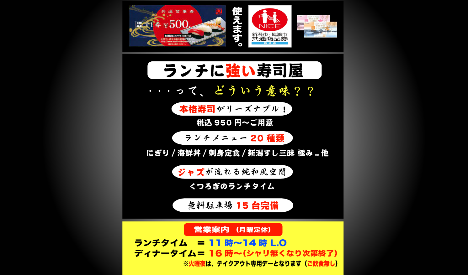 当店は、新潟市中央区紫竹山I.Cより1分という好立地のため、県内外からお車のお客様に多くご利用いただいております。土日※もお寿司が食べられるランチメニューを豊富にご用意しておりますので、行楽の行き帰りに新潟の寿司ランチはいかがでしょうか?