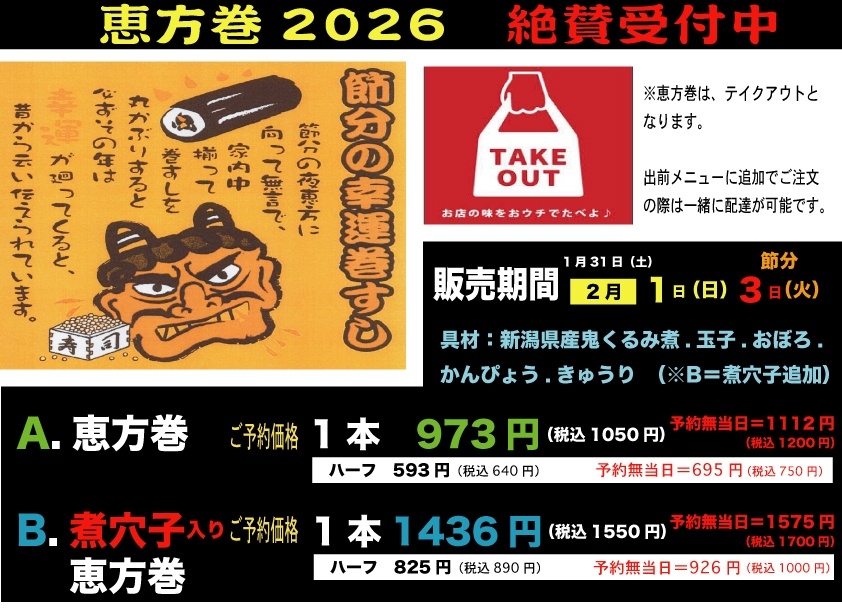 宅配のご注文はお電話でもネット経由からでもできます。 ================= ================= 創業50有余年 鮨割烹の味をお届けします。 鮮度 魚介類は毎日仕入れており、お店と同じ品質だから安心です。 握り 握りは寿司屋の命。 新潟市の出前!テイクアウトならおまかせ下さい!職人が握ってます、しゃりの大小おこのみに応じます。 価格 宅配方法のムダをなくすことで、価格を宅配専門店に近づけました。 【※出前価格&テイクアウト価格は異なります】 ★ 出前メニューを見る ★ ↑宅配↑ ↓お持帰り↓ ★ テイクアウトメニュー★ ★ 出前メニューを見る ★ 宅配の方は上の【★ 出前メニューを見る ★】をクリック [受付時間]10:00~19:00まで [定休日]月曜日 ★テイクアウトの方は↑電話番号クリック↑で発信します★